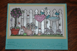 I really liked this stamp and decided to use it in my card this morning. I wanted to use just the Inspirations as I get a lot of questions about do you have to color the image first with a marker before painting. This is done with just the Inspirations, no markers. The Garden Gate stamp is from Stampassions I saw this on Ebay and just had to have it. The stamp on the bottom of the card is from Great Impressions and it is stamped with just Versamark then embossed with 1/2 clear embossing powder and 1/2 glitter. I used another Great Impressions stamp on the inside that says "Hello to one of the brightest flowers in the garden of my life!"