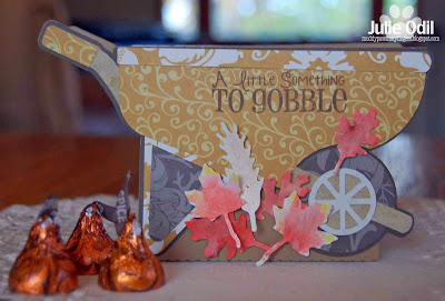 I had this idea for a wheelbarrow, and looked around until I found what I wanted. This is a wheelbarrow treat box. You can see it's been embellished with leaves painted with Creative Inspirations Paint. Here's a view of the other side.