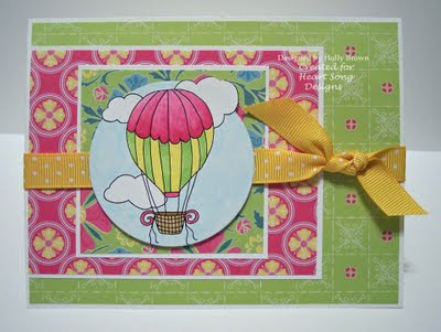 Good morning! It's Holly posting and today I'm sharing this bright and fun card with y'all. I colored this hot air balloon image from Heart Song Designs with Copic markers, and then I went over them with some shimmery Creative Inspirations Paint. Then I used the Out of the Box Nesties technique from Technique Junkies to cut this out and attached it to this card.